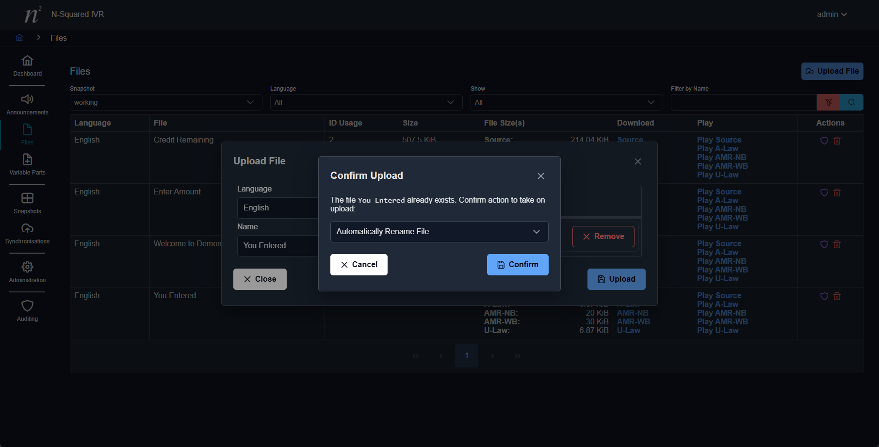 A file may be accepted as valid despite not meeting ideal standards for IVR playback. For example, the audio quality may be low. In such cases the upload will complete with a warning.