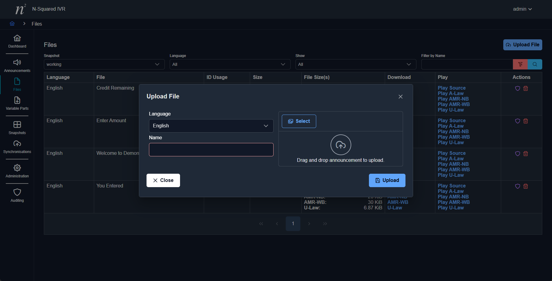 and a name that will be used to identify the audio file within the IVR GUI. The name must consist of text with only