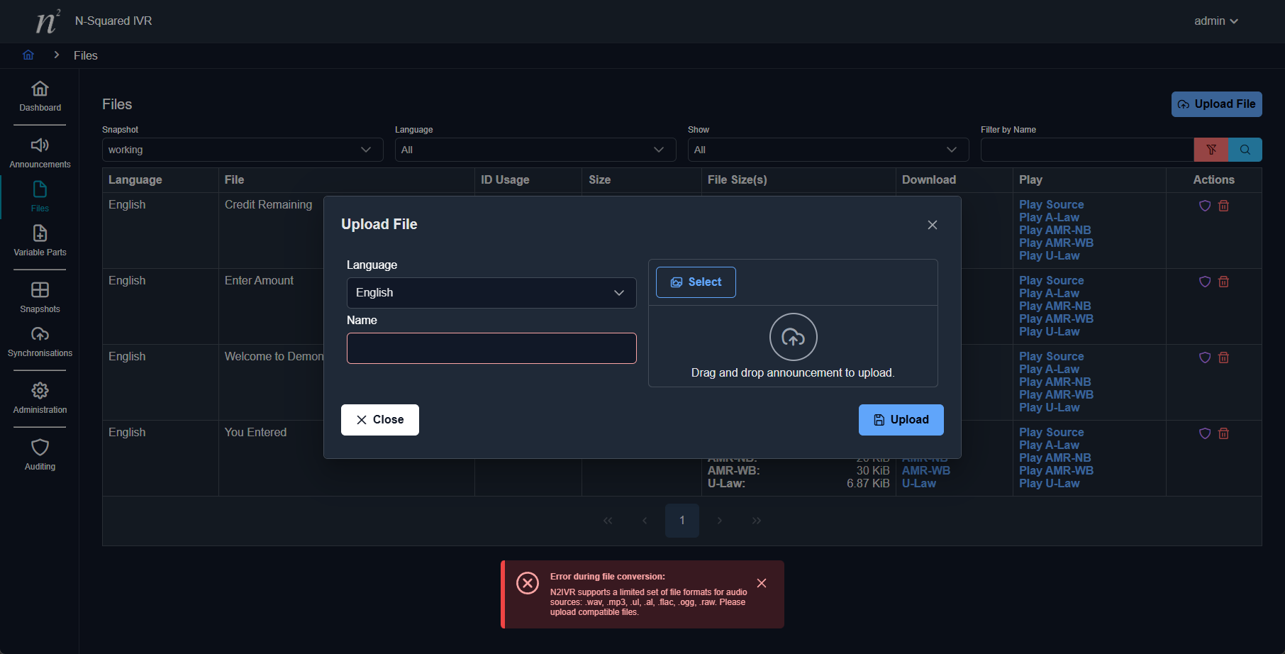 Files that do not appear to contain valid and/or supported audio content, or cannot be transcoded, will be rejected. All files must be able to be uploaded and converted from the uploaded format to the target format(s) configured by the system administrator.