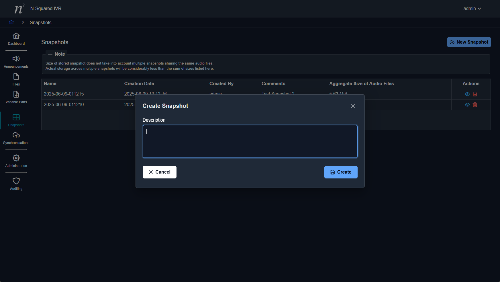 To create a snapshot, use the New Snapshot button, and provide a description: