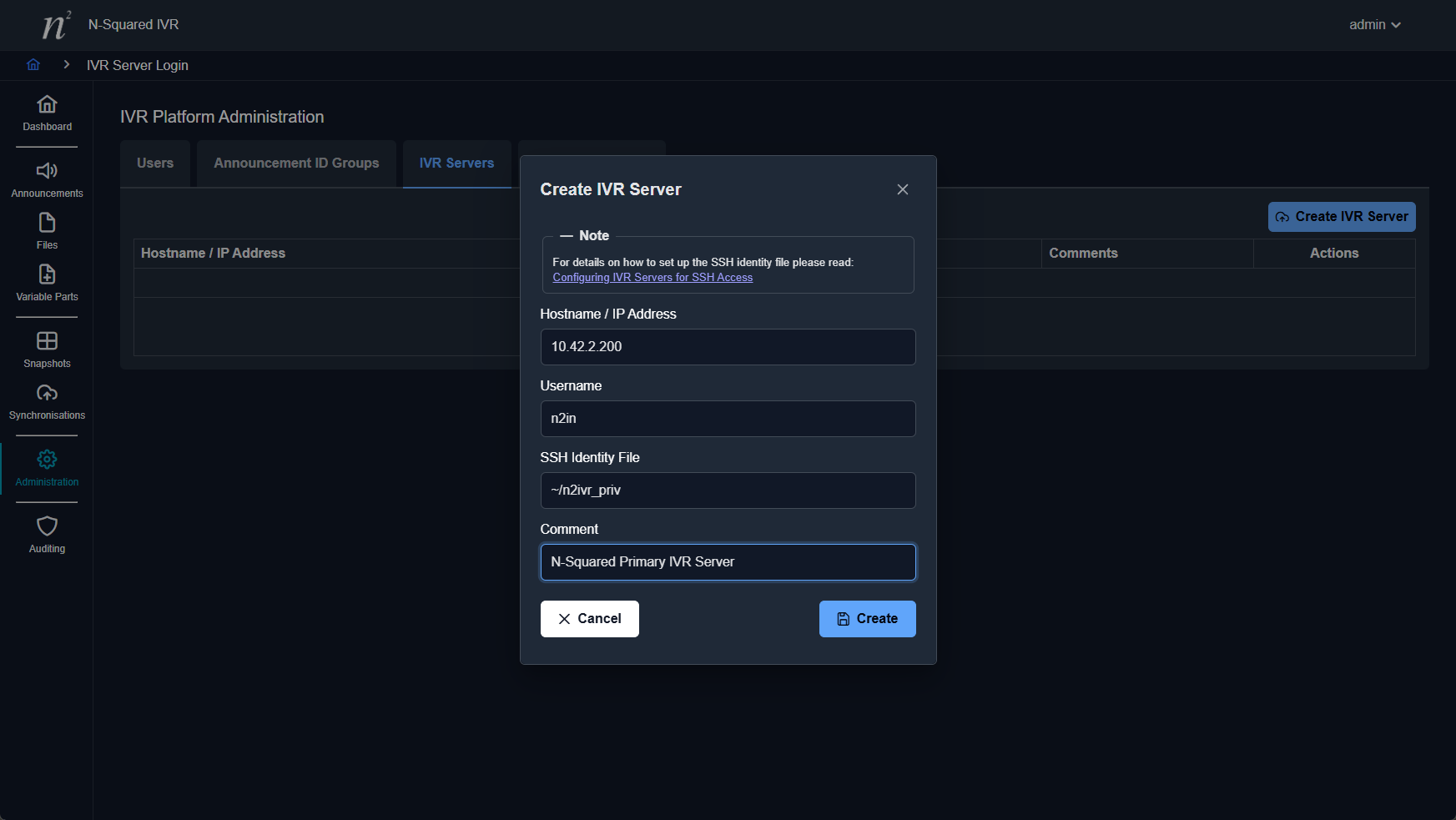 | SSH Identify File | If a unique SSH private key file is to be used for this connection, the full path to this file is required. If this file is not provided, the web-server user on the primary IVR is expected to be able to ssh to the host defined as the user given and log in without a password. This would usually require the private key to be the web-server user’s default one (i.e. ~/.ssh/id_rsa). |