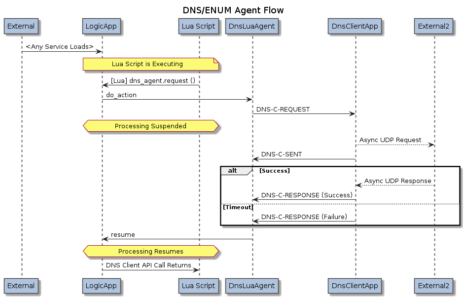 The DnsLuaAgent is an asynchronous helper for Lua scripts running within the LogicApp. It is used for sending out DNS (typically ENUM) client requests to a suitably configured DNS/ENUM server.