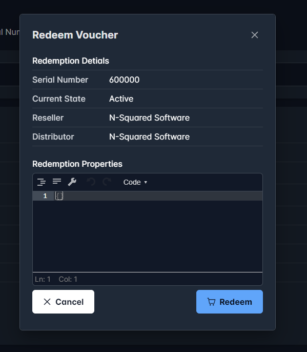 The Voucher being redeemed is summarized in the redemption dialog which provides an additional Redemption Properties; these properties should be defined depending on the remote OCS requirements when activating a Voucher. Often this will be items such as the MSISDN to associate with the redemption.