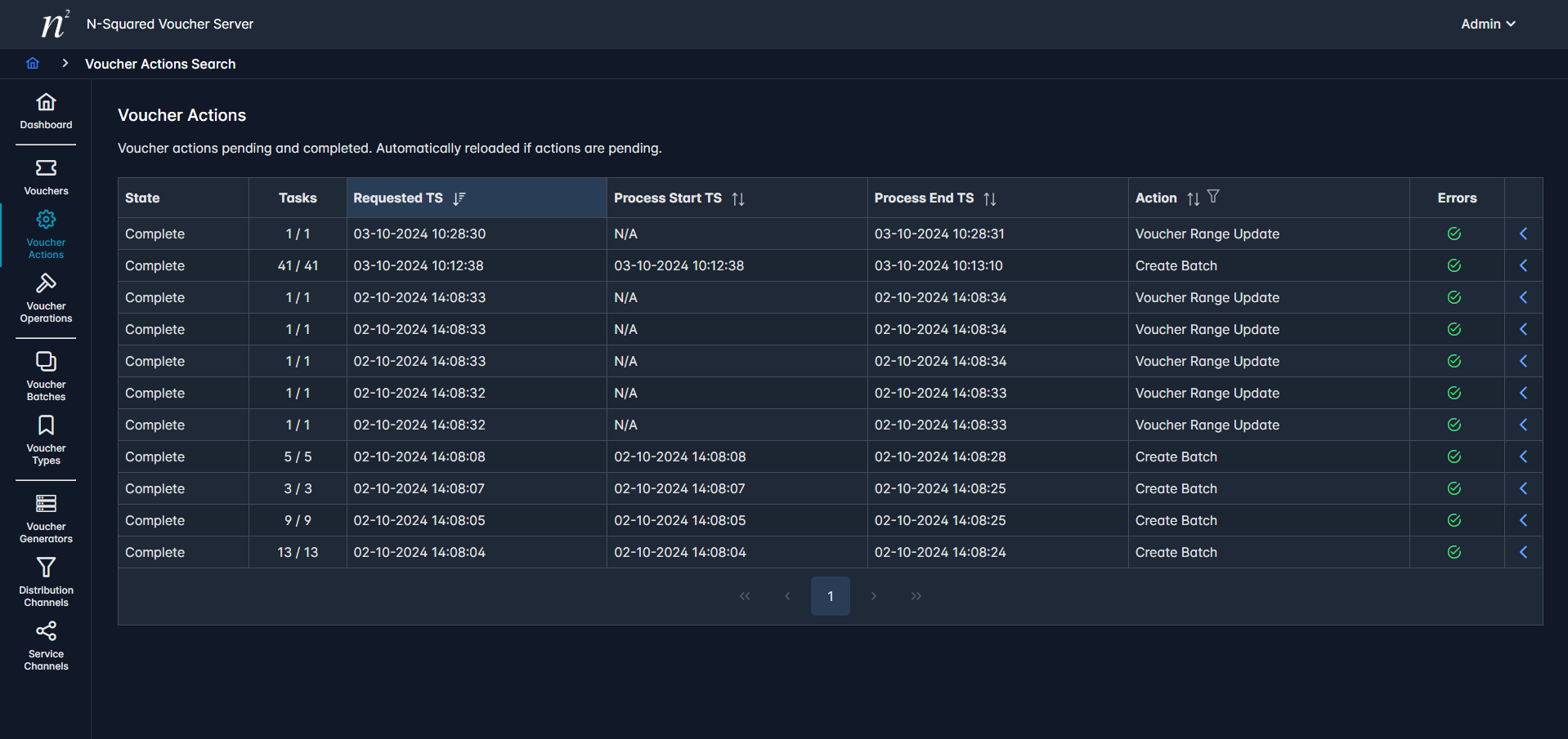 All displayed Voucher Actions will be shown with standard features for searching and sorting available via the table controls.