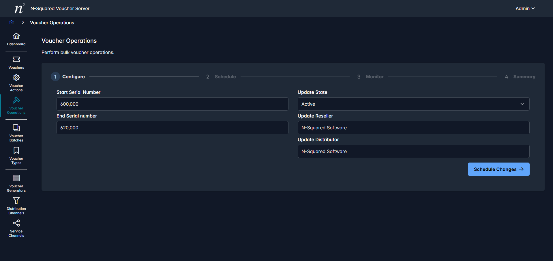 In the following example we will update a Voucher Range between 600,000 and 620,000 marking them as Active, while also setting the Reseller and Distributor fields to N-Squared Software.